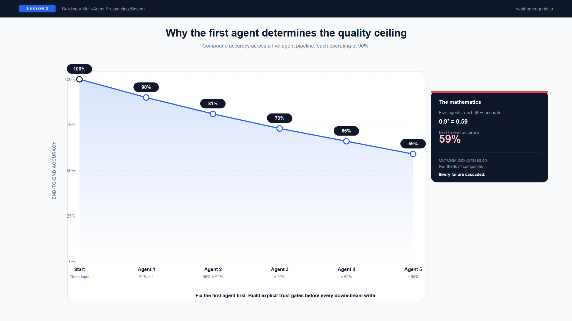 Figure 3. Compound accuracy across a five-agent pipeline. Five agents each operating at 90% accuracy yield 59% end-to-end — our CRM lookup was failing two-thirds of the time, and every failure cascaded.