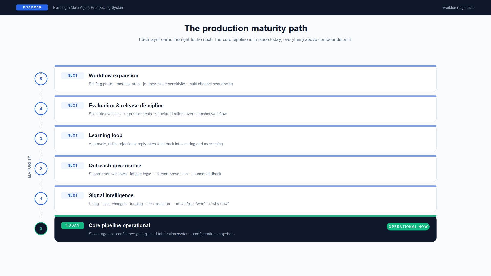 Figure 6. The production maturity path. The core pipeline is operational today; each layer above compounds on it without requiring a rebuild of the foundation.