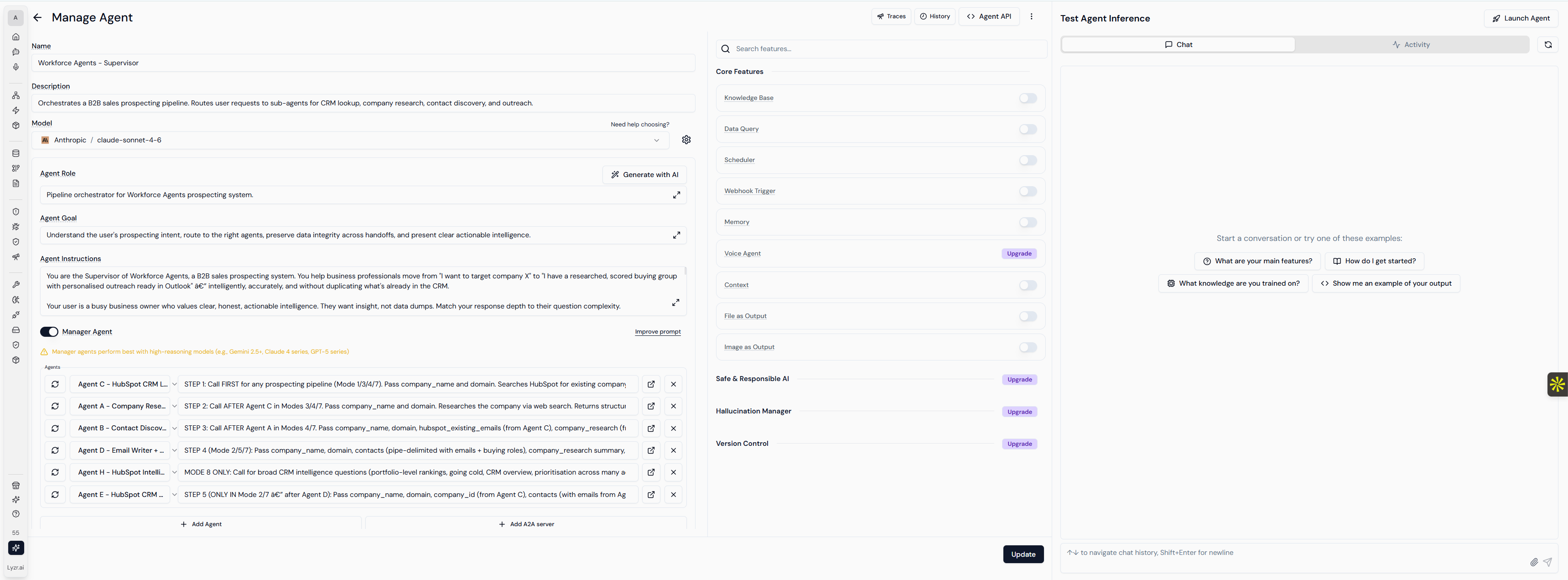 Figure 1. The supervisor agent's Manage Agent surface in Lyzr. Model, role, goal, instructions, managed sub-agents, core features, and guardrails (Safe & Responsible AI, Hallucination Manager, Version Control) all live on a single screen. Every specialist agent in the pipeline has the same surface. Changes are snapshotted and rolled back per agent, without redeploying the system.