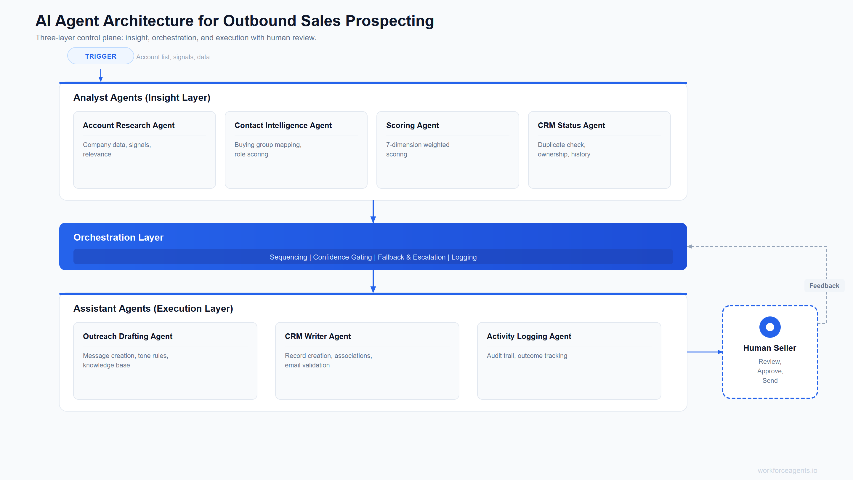 A workable outbound prospecting system is built as three coordinated layers: Analyst Agents, Assistant Agents, and an Orchestration Layer.