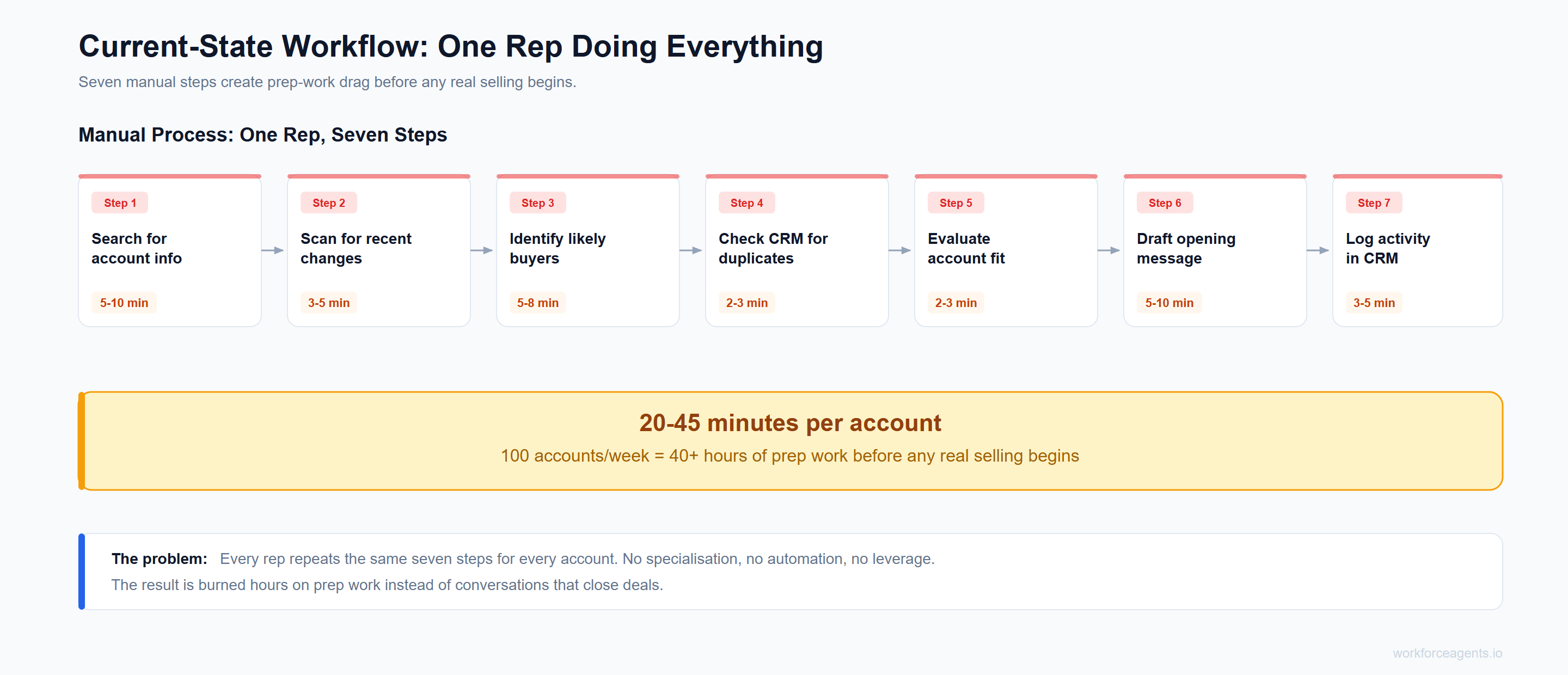 In a typical current-state process, a rep starts with a target account list or territory. They search public information to understand the business, scan for recent changes, identify likely buyers, check whether the account already exists in the CRM, decide whether the account is worth pursuing, draft an opening message, and then log activity back into the system. Even in disciplined teams, that sequence takes 20-45 minutes per account before any meaningful outreach happens.