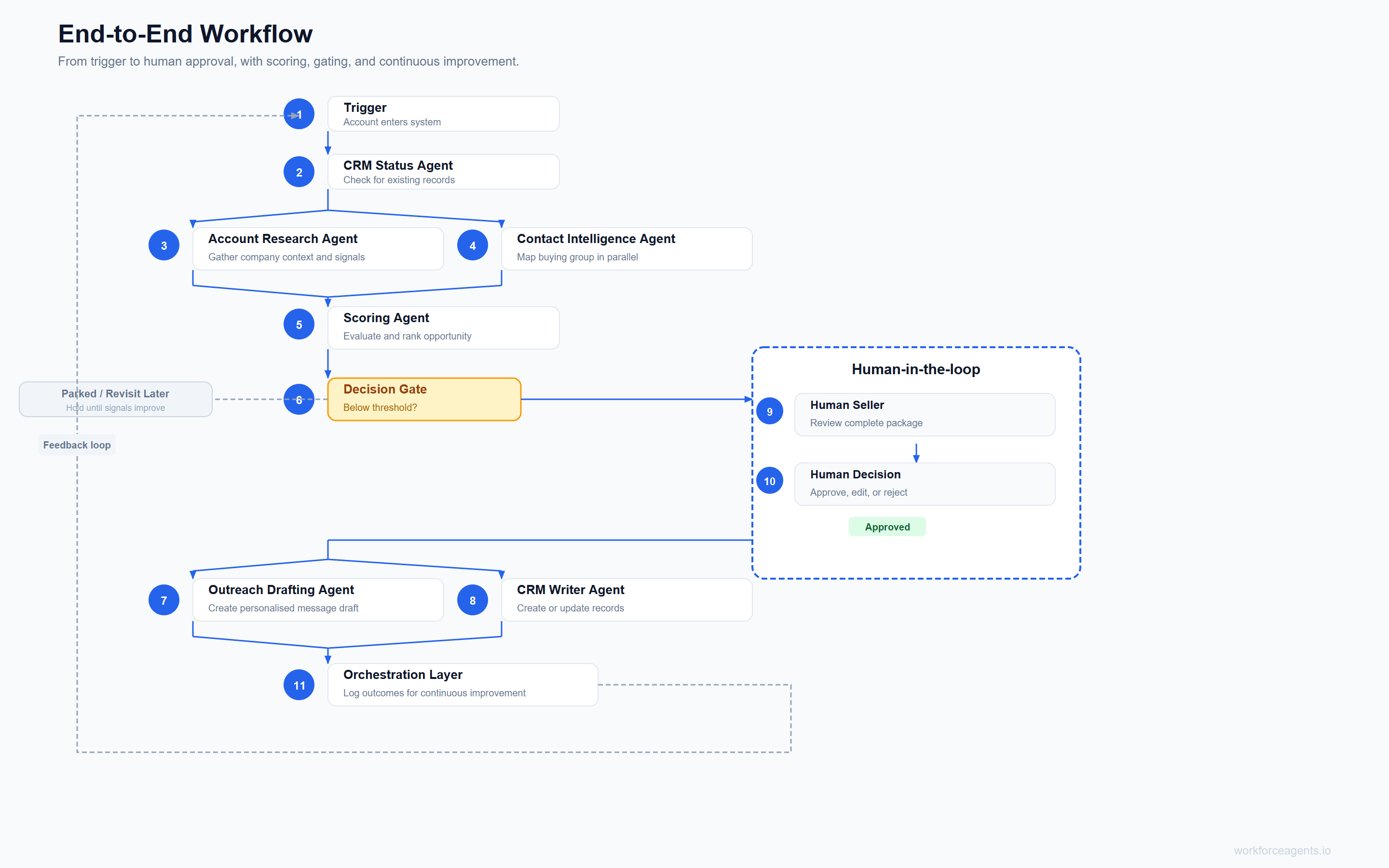 A trigger enters from a target account list, inbound signal, or seller request. The Orchestration Layer first sends the account to the CRM Status Agent. If the account is net-new or safe to progress, the workflow passes to the Account Research Agent and Contact Intelligence Agent in parallel. Their outputs feed the Scoring Agent, which ranks opportunity quality and urgency. If thresholds are met, the Outreach Drafting Agent creates a message draft and the CRM Writer Agent prepares record updates. The final package — account summary, contact recommendations, score rationale, and draft message — is routed to a human seller for review. All actions are logged centrally.